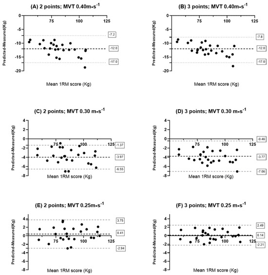 The repeated measures ANOVA was significant in males’ regression models, F (2.29) = 264.103; p < 0.001; and η2 = 0.917. Post hoc pairwise comparisons revealed that statistically significant differences were found between both prediction models (two and three points) constructed with the MVT of 0.4 m·s−1 (i.e., Optimal MVT) and the regression model with 0.3 m·s−1 and real 1RM; meanwhile, post hoc pairwise revealed no differences between the regression model (both two and three points) with real 1RM. Moreover, the repeated measures ANOVA was significant in females’ regression models, F (2.080) = 532.789; p < 0.01; and η2 = 0.957. Pairwise comparisons revealed that statistically significant differences were found between both the prediction models (two and three points), both constructed with the MVT of 0.3 m·s−1 and MVT of 0.40 m·s−1, and the models built with the MVT of 0.25 m·s−1 and the actual 1RM (p < 0.05). Conversely, no statistically significant differences were found between the models constructed with the MVT of 0.25 m·s−1 and the actual 1RM (p > 0.05).