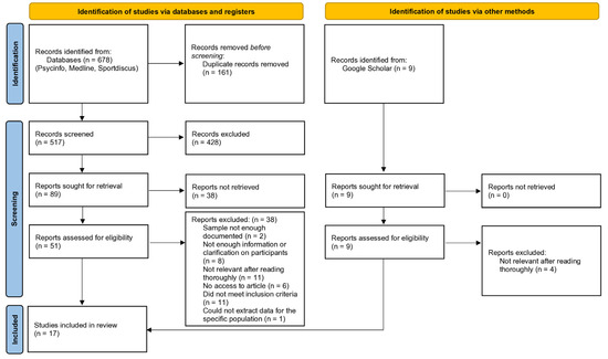 The initial search for potential articles was conducted 11–30 May 2022, generating a total of 687 articles. The original search timeframe targeted the past 20 years (2002–2022). However, since the writing process required more time than initially planned, the search was updated three times to include newly published articles, which extended the timeframe to 2025. Studies before 2002 were not considered to ensure that the review focused on practices, conceptual frameworks, and societal contexts more closely aligned with modern settings. As shown in Figure 1, the following databases were systematically searched: Psycinfo (138), Sportdiscus (218), and Medline (322). Potential sources considered relevant in GoogleScholar (9) were retrieved manually and also analyzed, bringing the total number of articles to 687. With the assistance of the university’s specialized librarian, key words used for the literature search included the following: psychological factor* OR anxiet* OR motivation* OR *confidence OR “self concept” OR “self esteem” OR passion* OR pressure OR resilience OR “emotional intelligence” OR coping OR “psychological adjustment*” OR “well being” OR “well-being” OR wellbeing. Descriptors were also added to target specific concepts in the literature search: DE “performance anxiety” OR DE “Self-esteem” OR DE “self-confidence” OR DE “psychological resilience” OR DE “psychological stress”. Moreover, we used the key words “ice hockey” OR “hockey player*” to obtain and limit articles to ice hockey only. Because no advanced settings were available for Google Scholar, a manual search was conducted using the key words “psychological factors” and “ice hockey” within the 2002–2025 timeframe and was completed by consulting reference lists.