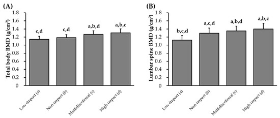 Comparison of total body (A) and lumbar spine (B) bone mineral density among sports types. Values are presented as mean ± standard deviation. BMD, bone mineral density; Low-impact, athletes participating in long-distance in track and field; Non-impact, athletes participating in lifesaving and water polo; Multidirectional, athletes participating in tennis, soft tennis, badminton, handball, basketball, boxing, and rhythmic gymnastics; High-impact, athletes participating in volleyball, fencing, judo, sprinting/jumping/throwing in track and field, weightlifting, and trampoline; ANOVA, analysis of variance. a p < 0.05 vs. low-impact; b p < 0.05 vs. non-impact; c p < 0.05 vs. multidirectional; d p < 0.05 vs. high-impact.
