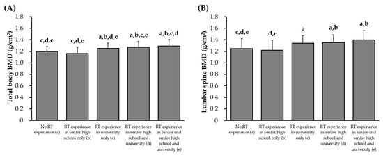 Comparison of total body (A) and lumbar spine (B) bone mineral density among resistance training experience. Values are presented as mean ± standard deviation. BMD, bone mineral density; RT, resistance training. a p < 0.05 vs. no RT experience; b p < 0.05 vs. RT experience in senior high school only; c p < 0.05 vs. RT experience in university only; d p < 0.05 vs. RT experience in senior high school and university; e p < 0.05 vs. RT experience in junior and senior high school and university.