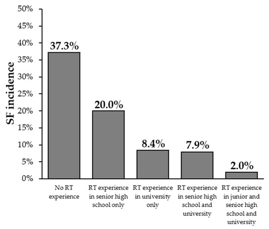 The incidence rates of SFs during university enrollment based on RT experience are shown in Figure 3. The highest incidence of SFs was observed in athletes with no RT experience (37.3%), whereas the lowest incidence was found in those who had RT experience in junior high school, senior high school, and university (2.0%).