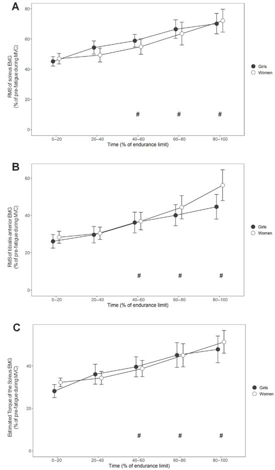 Group means and SDs of the soleus (A) and tibialis anterior (B) RMS EMG activity, along with the estimated torque based on the EMG/torque relationship before fatigue (C) across different time intervals (% of endurance limit). #: Significant time effect compared to 0–20 values.