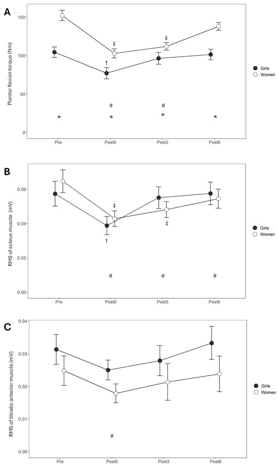Group means and SDs of torque (A) and RMS EMG activity of the soleus (B) and tibialis anterior (C) muscles before (Pre) and at 0, 3, and 6 min after the fatigue protocol (Post0, Post3, and Post6, respectively). *: Significant group differences, #: Significant time effect compared to Pre, †: Significant differences for girls compared to Pre, ‡: Significant differences for women compared to Pre.
