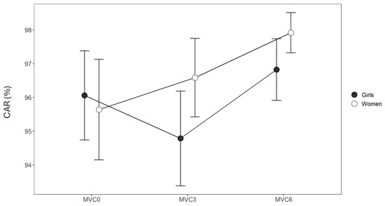As shown in Figure 3, the CAR demonstrated no significant effect for the GROUP (F = 0.4, p = 0.539) and TIME (F = 2.1, p = 0.133) factors or their interaction (F = 0.8, p = 0.463).