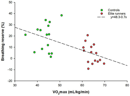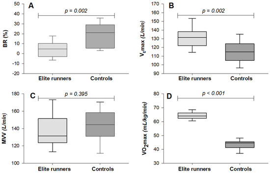 The present study has several limitations that should be considered when interpreting the results. Firstly, the examined sample, consisting of 15 elite runners and 15 controls, was relatively small, which may limit the generalizability of our findings and reduce the statistical power to detect minor differences or nuanced relationships. In addition, the controls were recruited from the same university, which makes it hard to strictly rule out any selection bias. Further, the inclusion of complementary measures such as arterial oxygen saturation, ventilatory thresholds, and respiratory muscle strength would have enhanced the physiological interpretation of the observed BR; however, these data were unfortunately not collected in the present study. Without these additional data, it is impossible to definitively determine whether a reduced BR significantly limits VO2max.