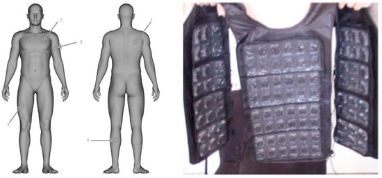 Details of the skin marker positions and the cool vest device. 1. Right scapula; 2. left chest; 3. left arm in upper location; 4. right anterior thigh; 5. left calf.