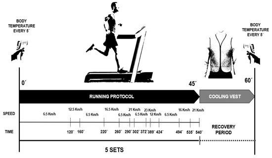 Exercise Protocol: Three days before the study, participants were instructed not to consume caffeine or alcohol 24 h before each trial, and to avoid eating for 2 h before the test. However, they were encouraged to drink water or other non-caffeinated, non-alcoholic beverages freely before the trials “ad libitum”. The exercise protocol consisted of a 45 min intermittent running session on a motorized treadmill, reflecting the time spent at various speed levels based on data from match analysis of Spanish soccer players [32]. The protocol included five 9 min running bouts at speeds of 6.5, 12.5, 16.5, 21, and 23 km·h−1, representing 63%, 14%, 15%, 5%, and 3% of the protocol duration, respectively. Intensity levels were organized in a non-cyclical manner in an attempt to reflect the nature of a 45 min soccer game (Figure 2). The protocol was specifically developed for the present study based on the data presented in Di Salvo et al. [32]. In this study, the authors analyzed movement kinematics in professional soccer players to quantify running performance parameters (running distances and speeds) across different playing positions. Similar protocols have been applied recently in other studies, such as Brown et al. [33]. Unfortunately, the use of a motorized treadmill precluded the inclusion of true sprinting, backwards running and sideways activities. Once finished, the participants were allocated to two groups, involving either no cooling or the application of a cool vest during the 15 min seated recovery (simulating halftime). The exercise protocol was conducted in a laboratory room under a constant temperature of 22 ± 1.9 °C and 30.8 ± 4.8% relative humidity.