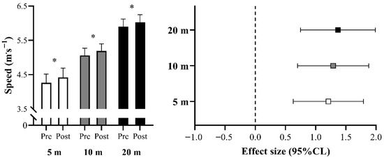 Comparisons of sprinting speed over the different distances tested between pre- and post-tests. CL: confidence limits; * p < 0.05.