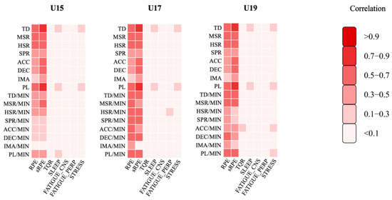 The relationship between IL- and GPS-derived variables among U15, U17, and U19 according to the combination of training sessions and matches.