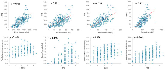 The relationships between s-RPE, RPE, and GPS-derived volume and intensity variables for U17 during training sessions.
