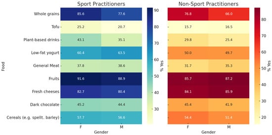 Significant gender differences in food preferences by type of sport. Heatmap showing the percentage of participants who reported a positive preference (“Yes”) for selected food items, stratified by weekly hours of sport practice. Significant differences across sport activity levels were observed for the following items (chi-square test): vegetable-based drinks (p = 4.7 × 10−6), low-fat white yogurt (p = 7.5 × 10−7), whole grains (p = 4.0 × 10−5), raw vegetables (p = 1.5 × 10−5), and tofu (p = 2.5 × 10−6).