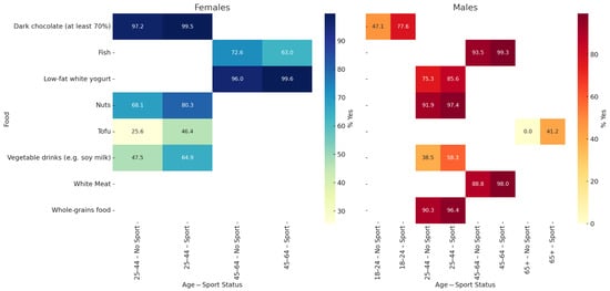 Significant differences in food preferences by gender, age group, and sport participation. These heatmaps show the percentage of participants who answered “Yes” for each food, stratified by gender (left: females; right: males), age group (18–24, 25–44, 45–64, 65+), and sports participation (Sport vs. No Sport). Only food × age × gender combinations showing statistically significant differences (p < 0.05) between those who participate in sport and those who do not were included. Female p-values (Sport vs. No Sport): cow’s milk (25–44: p = 0.0222), vegetable-based beverages (25–44: p = 0.0001; 45–64: p = 0.0012), low-fat yoghurt (25–44: p = 0.0029), general meat (45–64: p = 0.0046), red meat (45–64: p = 0.0077), pulses (25–44: p = 0.0077), legumes (25–44: p = 0.0016), cooked vegetables (25–44: p = 0.0023), cereals (45–64: p = 0.0036), whole grains (25–44: p < 0.0001), tofu (25–44: p = 0.0063), and dark chocolate (25–44: p = 0.0188). Male p-values (Sport vs. No Sport): cow’s milk (18–24: p = 0.0436), vegetable-based beverages (25–44: p = 0.0002), low-fat yoghurt (25–44: p < 0.0001), red meat (25–44: p = 0.0122), pulses (25–44: p = 0.0126), cooked vegetables (25–44: p = 0.0088), cooked vegetables (25–44: p = 0.0039), raw vegetables (25–44: p = 0.0137), whole grains (25–44: p < 0.0001), tofu (25–44: p = 0.0077), and dark chocolate (25–44: p = 0.0100).