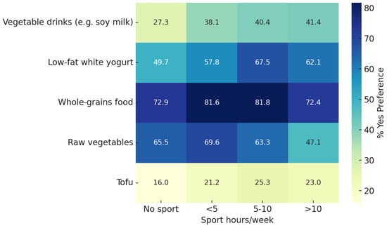 A chi-square analysis comparing food preferences across four levels of weekly sport participation revealed significant differences for five food items: vegetable-based drinks, low-fat white yogurt, whole grains, raw vegetables, and tofu (all p < 0.001). As shown in Figure 5, the proportion of participants reporting a preference for these foods was generally higher among those engaging in sport, although not consistently increasing with the number of weekly hours.