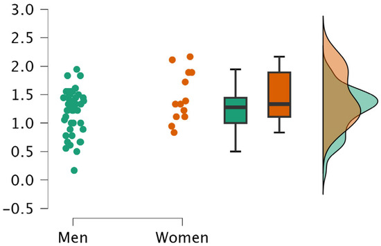 An independent t-test revealed significantly higher stress levels (Factor 1) in women compared to men (t = −2.04, p = 0.046, ES = −0.64; see Figure 1). However, no significant differences were found in Factor 2—Quick Decision (positive and negative) (p = 0.282 and 0.955, respectively) or in Factor 3—Determination (p = 0.133).