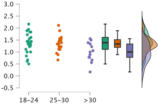 Significant differences were observed between groups of age in factor 1 (stress). Groups of 18–24 years and 25–30 years demonstrated significantly higher values than >30 years (p = 0.025 and 0.046, respectively, see Figure 2). In contrast, no significant differences were found in the other two factors (p > 0.05, see Table 2).