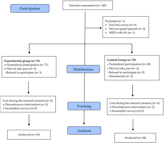 The sample consisted of 127 students (control group—TM = 64; experimental group—SEM = 63) aged between 11 and 14 years (12.8± 0.52). The control group received classes using TM, through teaching styles such as task assignment and microteaching. Conversely, the intervention for the experimental group was characterized by a methodology based on Siedentop’s SEM (6, 7). The selection of classes for the formation of both groups followed a randomized criterion, with the following exclusion criteria: (i) not belonging to the first year of Spanish Secondary Education, (ii) not speaking or having significant difficulties in handling Spanish, and (iii) students with significant curricular adaptations in the subject due to being Students with Special Educational Needs. This entire process can be seen in Figure 1.