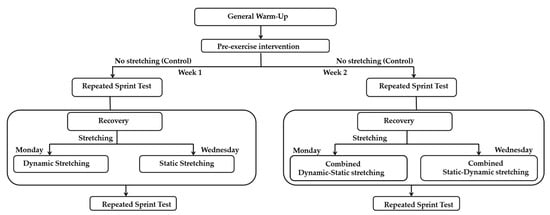 Following the general warm-up and pre-exercise intervention (or no intervention in the control condition), participants rested for 2 min before performing the repeated sprint test. Each stretching condition included approximately 6 min of stretching. In the control condition, the repeated sprint test was conducted after 2 min of recovery post-warm-up, without any stretching.