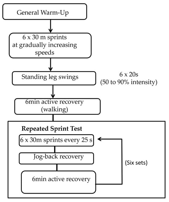 The tests were carried out across two days, with a 72 h gap between sessions. The repeated sprint performance in the NS condition acted as the control. The study was conducted in March, during the official competitive season. To reduce the impact of circadian rhythm on performance, all sessions were scheduled at the same time as the participants’ usual training sessions (in the evenings) and were conducted under stable temperature conditions (23–25 °C). The warm-up protocol is illustrated in Figure 2.