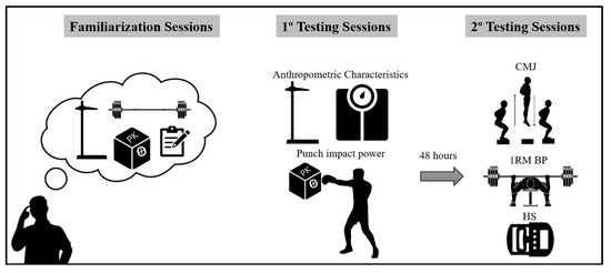 Both testing sessions were conducted by the same researcher and two boxing coaches at the boxing gym, over two days between 8:00 and 11:30 a.m. Participants were instructed to abstain from consuming caffeine, alcohol, or engaging in strenuous physical activity during the 24 h preceding each test session. In the week prior to experimentation, athletes conducted two familiarization sessions with the testing procedures to minimize the learning effect. On the first day, anthropometric measurements were obtained (8:00–10:00 a.m.), followed immediately by an assessment of punch impact power using the PK device (Strike Research Ltd., Norwich, England) (10:00–11:30 a.m.). The second session, conducted after a minimum of 48 h to mitigate potential fatigue effects, focused on physical performance assessment (CMJ, 1RM BP, and HS). Participants were required to avoid any training or strenuous activities during the 48 h preceding each testing session to ensure reliable performance outcomes. The experimental procedures are detailed in Figure 1.