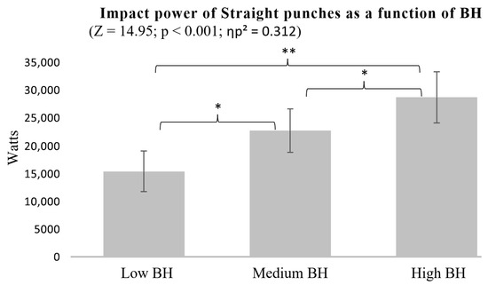 Impact power of Straight punches as a function of BH. * p < 0.05, ** p < 0.01.