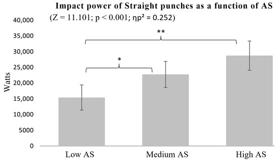Impact power of Straight punches as a function of AS. * p < 0.05, ** p < 0.01.