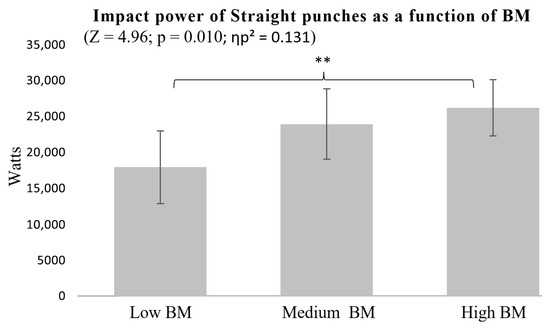Impact power of Straight punches as a function of BM. ** p < 0.01.
