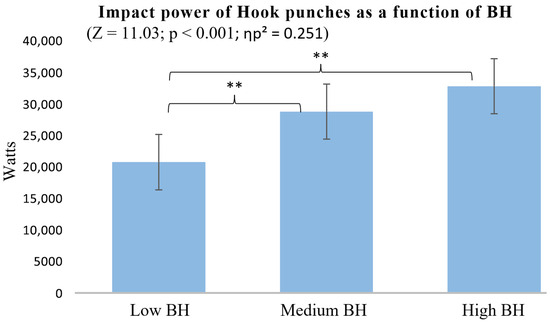 Impact power of Hook punches as a function of BH. ** p < 0.01.