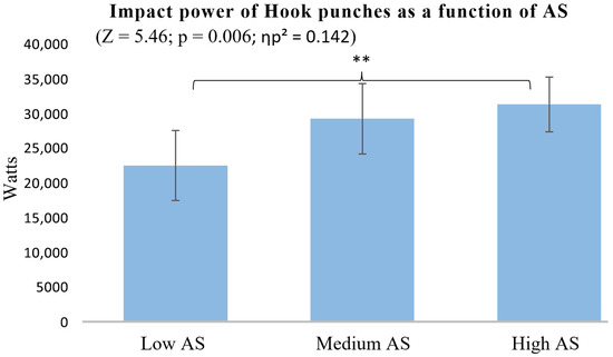Impact power of Hook punches as a function of AS. ** p < 0.01.