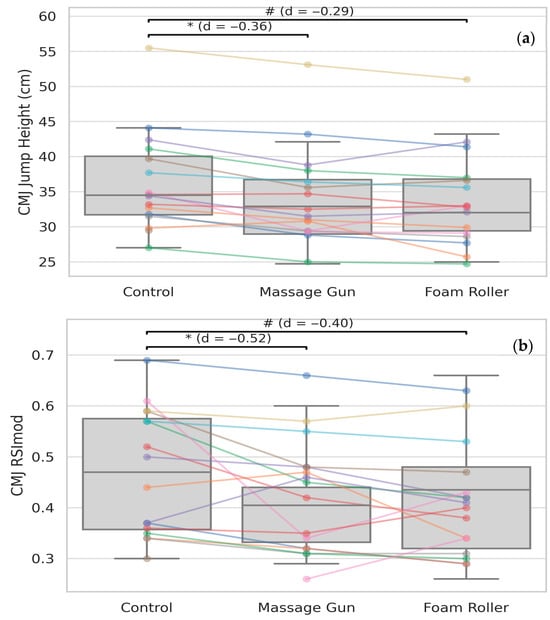 | CMJ RSImod | 0.47 ± 0.12 | 0.41 ± 0.10 * | 0.42 ± 0.11 # | <0.01 |