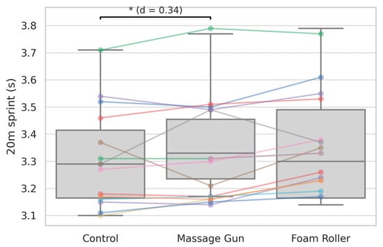 | 20 m sprint (s) | 3.31 ± 0.18 | 3.37 ± 0.17 * ^ | 3.32 ± 0.19 ^ | <0.01 |