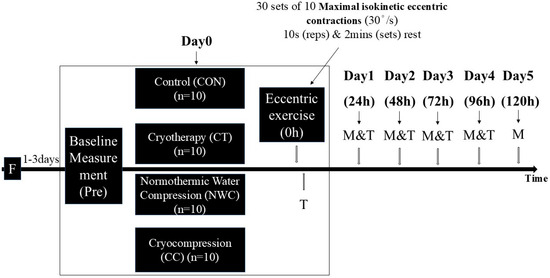 For statistical analysis, the independent variables were grouped (CON, CT, NWC, CC) as the between-subject factor and time was grouped (pre-exercise, 24 h, 48 h, 72 h, 96 h, and 120 h post-exercise) as the within-subject factor. The dependent variables included: