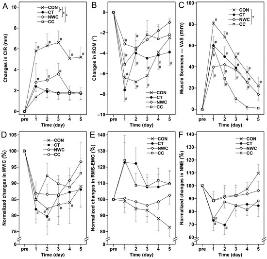 Changes (mean ± SEM) in upper thigh circumference (CIR, (A)), range of motion (ROM, (B)), muscle soreness assessed by a 100 mm visual analog scale (VAS, (C)), normalized maximal voluntary isometric contraction (MVIC, (D)), normalized root mean square electromyography (RMS-EMG, (E)), and normalized neuromuscular efficiency (NME, (F)) at baseline (i.e., pre), and 1, 2, 3, 4, and 5 days (1–5) after the eccentric exercise performed across four different groups. *: a significant (p < 0.05) interaction effect determined by two-way mixed ANOVA. #: a significant (p < 0.05) difference from baseline (i.e., pre) value.