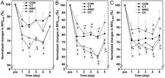 Changes (mean ± SEM) in normalized RFD0–50 (A), RFD0–100 (B) and RFD0–200 (C) at baseline (pre), and 1, 2, 3, 4, and 5 days (1–5) after the eccentric exercise performed across four different groups. #: a significant (p < 0.05) difference from baseline (i.e., pre) value.