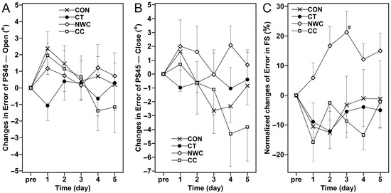 Changes (mean ± SEM) in error of knee position sense-open (PS45—Open, (A)), error of knee position sense-close (PS45—Close, (B)) and normalized error of force sense (FS, (C)) at baseline (pre), and 1, 2, 3, 4, and 5 days (1–5) after the eccentric exercise performed across four different groups. #: a significant (p < 0.05) difference from baseline (i.e., pre) value.