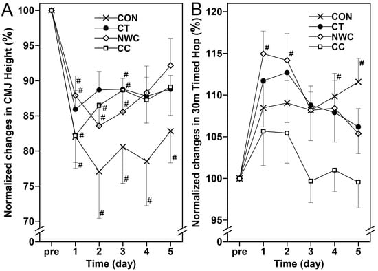 Changes (mean ± SEM) in normalized countermovement jump (CMJ) height (A) and 30 m timed hop test (B) at baseline (pre), and 1, 2, 3, 4, and 5 days (1–5) after the eccentric exercise performed across four different groups. #: a significant (p < 0.05) difference from baseline (i.e., pre) value.