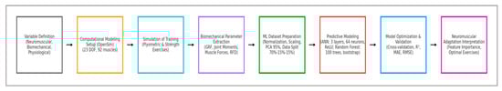 The methodological framework unfolds as a continuous pipeline in which eight interdependent stages are organized into three macro-phases: simulation, data processing, and machine learning and interpretation. The process begins with the definition of the neuromuscular, biomechanical, and physiological variables of interest, followed by the configuration of a validated OpenSim musculoskeletal model tailored to this study’s aims. Standardized plyometric and strength-training scenarios are then simulated, yielding high-fidelity biomechanical outputs, such as ground reaction forces, joint moments, muscle activations, and rate of force development. These outputs are systematically transformed into structured parameters, ensuring consistency across tasks and replicates.