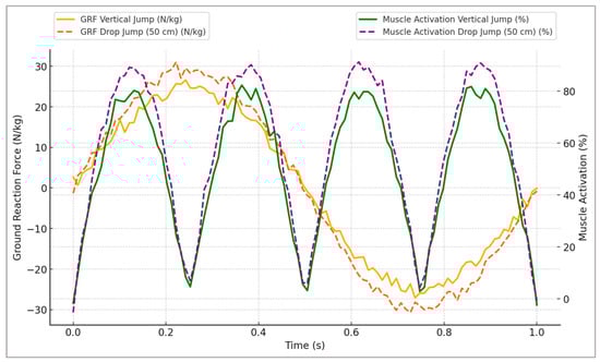 Figure 2. Representative time-series profiles of ground reaction forces (GRFs) and muscle activation during simulated vertical and drop jumps (50 cm), highlighting specific neuromuscular adaptations induced by plyometric training.