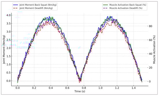 Figure 3. Representative joint moment and muscle activation profiles during simulated back squat and deadlift exercises, illustrating specific neuromuscular adaptations resulting from strength-training scenarios.