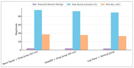 Figure 4. Predicted optimal combinations of strength and plyometric exercises illustrating peak joint moment, muscle activation, and rate of force development (RFD). Parameters derived from integrated machine learning analyses clearly highlight the superior neuromuscular adaptations associated with specific combined training scenarios.