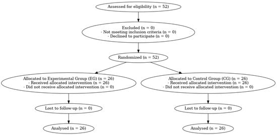 CONSORT-style flow diagram of participant enrollment, allocation, follow-up, and analysis. A total of 52 students were assessed for eligibility; none were excluded; 52 were randomized (EG = 26; CG = 26); all received the allocated intervention; no loss to follow-up occurred; and all participants were included in the final analyses.