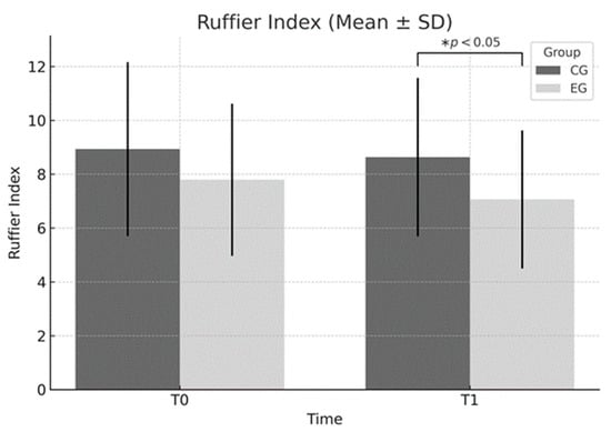 Ruffier Index (mean ± SD) at baseline (T0) and post-intervention (T1) in the experimental (EG) and control (CG) groups. A significant main effect of group was observed (F = 5.666, p = 0.019), indicating better overall cardiovascular efficiency in the EG. No significant time × group interaction was found. * p < 0.05 between groups at T1.