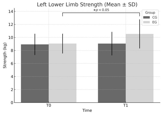 Left lower limb strength (mean ± SD) at T0 and T1 for EG and CG. Significant main effects were found for group (F = 5.169, p = 0.025) and time (F = 5.066, p = 0.027), while the group × time interaction approached significance (p = 0.057). * p < 0.05 within-group improvement from T0 to T1 in the EG.