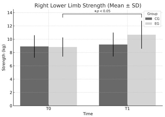 Right lower limb strength (mean ± SD) at T0 and T1 in EG and CG. Significant main effects for group (F = 4.006, p = 0.048), time (F = 9.437, p = 0.003), and group × time interaction (F = 5.031, p = 0.027) indicate a markedly greater improvement in the EG. * p < 0.05 within-group improvement from T0 to T1 in the EG.