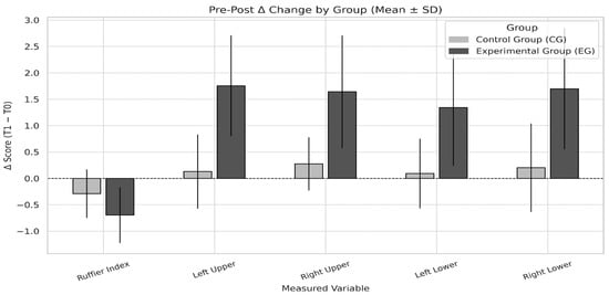 Δ-change (T1 − T0) in each measured variable for EG and CG (mean ± SD). Variables include Ruffier Index, left/right upper limb strength, and left/right lower limb strength. Positive deltas represent increases in strength; negative delta in the Ruffier Index indicates improved cardiovascular efficiency. The EG showed larger positive deltas for all strength measures and a greater reduction in the Ruffier Index compared to the CG.