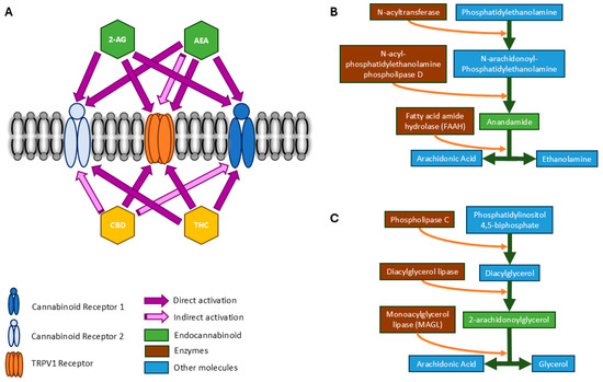 Schematic of major components of the endocannabinoid system. Panel (A) depicts the interaction of different cannabinoids and cell receptors. AEA activates CB2 as a primary agonist and is a partial agonist of CB1. High concentration of AEA activates TRPV1 directly and indirectly. 2-AG activates CB1 and CB2 as an agonist for both and activates TRPV1 at a higher concentration than AEA. Phytocannabinoids (described in more detail below) can also activate the endocannabinoid system. CBD indirectly activates CB1 and CB2 by influencing fatty acid amide hydrolase (FAAH) and monoacylglycerol (MAGL), and by binding to the allosteric site. CBD also activates TRPV1 at low concentrations. THC binds directly to CB1, CB2, and TRPV1 as a partial agonist. Panels (B,C) depict mechanisms of synthesis and degradation of AEA and 2-AG. The on-demand mechanism of endocannabinoid supply involves degradation and synthesis of enzymes. Phosphatidylethanolamine is the precursor of AEA. FAAH is the key enzyme that degrades it. Phosphatidylinositol is the precursor of 2-AG, and MAGL is its degradation enzyme.