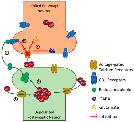 Mechanism of endocannabinoid retrograde signaling and depolarization-induced suppression of inhibition and excitation (DSI and DSE, respectively) in a neuronal synapse. (A) Depolarization of the postsynaptic neuron induces calcium ions to enter via voltage-gated channels, increasing the calcium concentration. (B) High calcium concentration forces endocannabinoids to enter the intersynaptic space. (C) Endocannabinoids bind to CB1 receptors and activate them. (D) CB1 activation blocks the calcium channels from opening to calcium ions. (E) Membrane potential is not high enough to induce the release of neurotransmitters, hence delaying the GABA-induced inhibition and glutamate-induced excitation.
