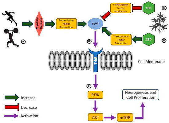 The effects of phytocannabinoids on BDNF expression in neuronal cells. (A) Exercise induces the production and release of myokines (e.g., irisin) which then travel through the blood–brain barrier to trigger the production and release of BDNF. (B) CBD intake promotes transcription factors that lead to BDNF release. (C) THC-induced CB1 activation inhibits the upregulation of factors responsible for BDNF release. (D) BDNF binds to the tropomyosin receptor kinase B (TrkB) receptor located on the neurons’ cellular membrane and triggers its activation. (E) TrkB receptors turn on the crucial phosphatidylinositol 3-kinase (PI3K) pathway, including protein kinase B (also known as AKT) and mammalian target of rapamycin (mTOR) protein, responsible for growth, proliferation and survival of neurons.
