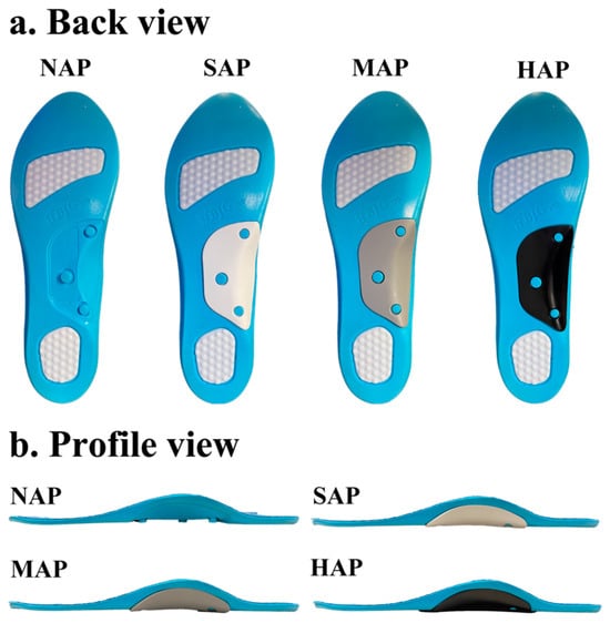 - Chen, H.; Zhang, Q.; Biró, I. Effects of Arch Support Pads and Insoles on Gait Parameters and Plantar Mechanics During Running in Adults with Flatfoot. In Proceedings of the 2024 IEEE 7th International Conference and Workshop Óbuda on Electrical and Power Engineering (CANDO-EPE), Budapest, Hungary, 17–18 October 2024; IEEE: New York, NY, USA; pp. 99–102. [Google Scholar]