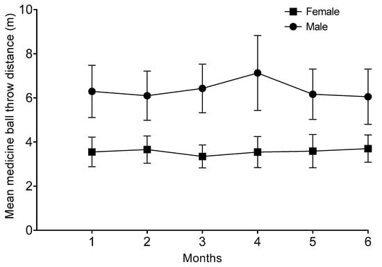 Table 3 presents the results for the power–load relationship of the arm extensor muscles, both for the male and female athletes. The male athlete produced the highest medicine ball throw values during the 4th month, while the female athlete demonstrated progressive increases across the training period. Moreover, the average performances across all ball throws for both athletes are presented in Figure 1.