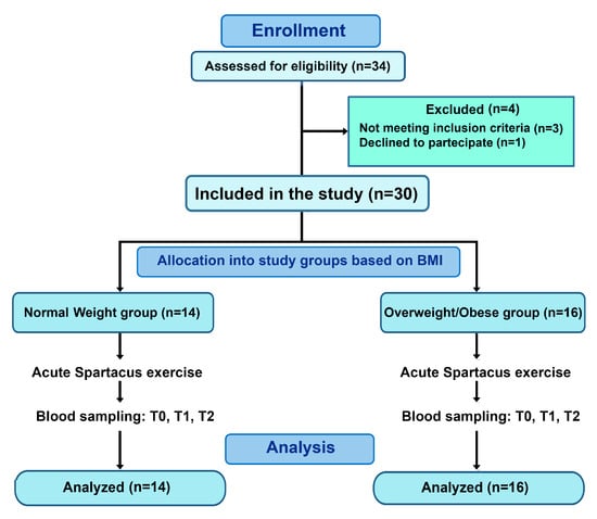 Flow diagram of participant recruitment and allocation. Thirty participants were included and allocated based on BMI into a normal-weight group (BMI: 21.93 ± 0.99 kg/m2) and an overweight/obesity group (BMI: 31.17 ± 3.85 kg/m2). All participants completed the acute Spartacus exercise protocol and blood sampling at T0, T1, and T2.